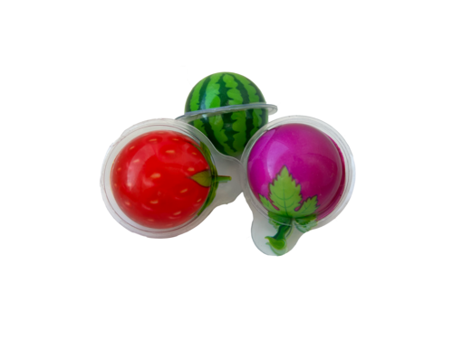 Socker, glukossirap, nötgelatin, pektin, fruktjuice, natriumcitrat, syror(citronsyra, äppelsyra), karnaubavax, aromämnen (druvor, jordgubb, vattenmelon, mango), färgämne (E163, E162, E120, E160a) (VARNING, innehåller ej ätbara plastbitar. Rekommenderas ej för barn under 3 år)