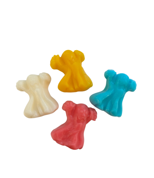 glykossirap, socker, vatten, gelatin, syra: citronsyra, vegetabilisk olja (solros), aromämne, färgämne: E120, E131, E161b, bivax